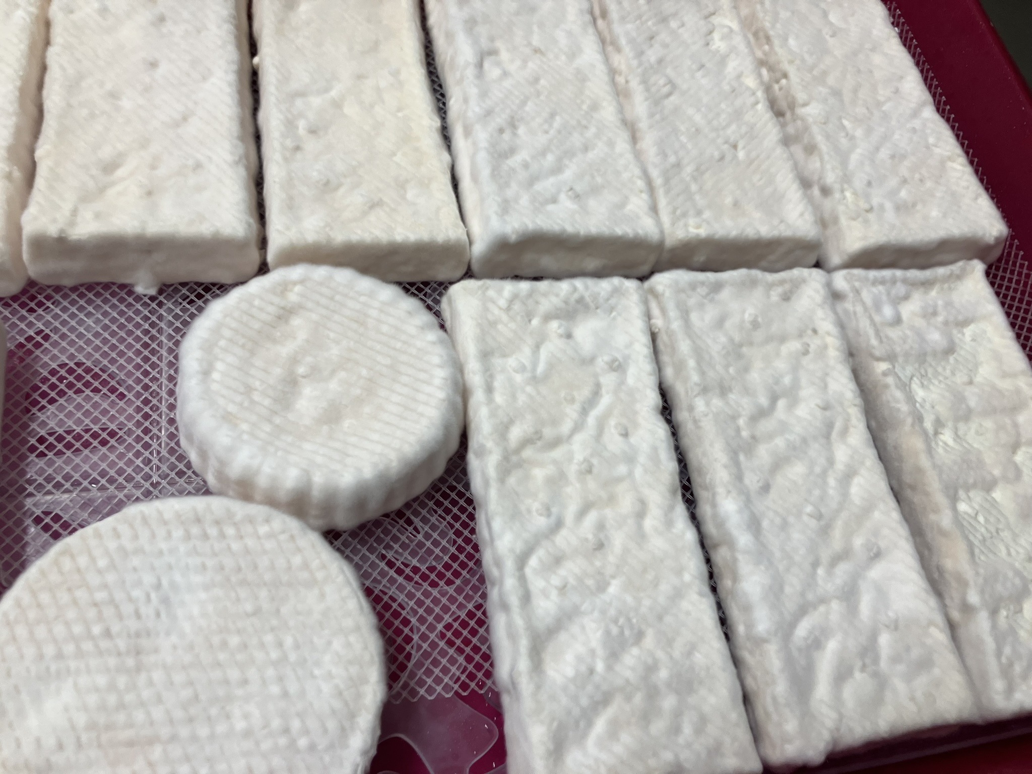Sery z porostem pleśni Penicilium camemberti. Kształt prostokątny lub okrągły, powierzchnia pokryta delikatnym jasnym puszkiem, łagodny, pieczarkowy smak.